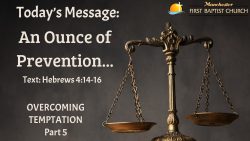 An Ounce of Prevention December 4, 2022 Video Audio https://www.manchesterfbc.org/wp-content/uploads/2022/12/An-Ounce-Audio-CD.mp3Scriptures: Hebrews 4:14-16 1 John 1:9 SHARE ON Twitter Facebook Buffer LinkedIn Pin It Leave a Reply Cancel replyYour email address will not be published. Required fields are marked *Comment * Name * Email * Website Δ Continue Reading The Principle of the Sabbath Advent II – The Return